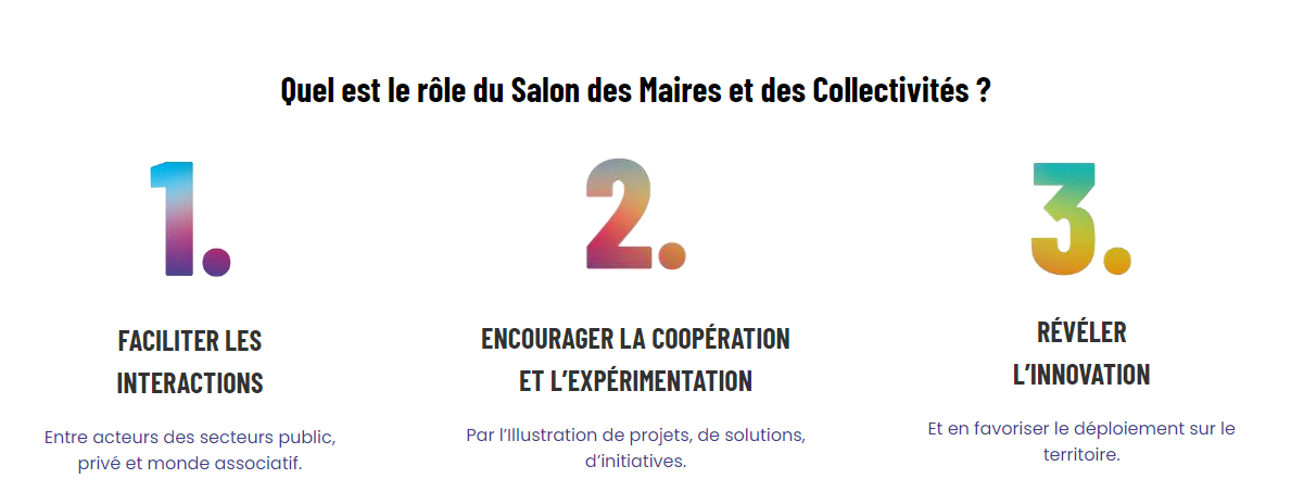 Le SALON DES MAIRES ET DES COLLECTIVITÉS est un lieu propice à la CONSTRUCTION COLLECTIVE où les maires, leurs équipes, les acteurs des secteurs public & privé et le monde associatif collaborent au quotidien pour relever les défis urgents auxquels sont confrontés les collectivités.